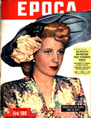 Raccolte dedicate a particolari personaggi o avvenimenti. La Guerra nel Pacifico (Dossier completo di 96 pagine pubbl. a dispense) L'Affare Montesi (Tutti i servizi pubblicati su un mistero degli anni '50, mai risolto) 25 Luglio 1943 (Storia, dibattiti, documenti) Cara Italia (una serie di monografie sulle regioni italiane) Speciale Tauranga (la barca a vela della prima regata intorno al mondo) (se hai qualche particolare argomento che ti sta a cuore, scrivici) Fascicoli interi Vol. I, n. 1, 14 ottobre 1950 (pubbl. 3 maggio 2011 - 5 giugno 2022) Questo è il primo numero del settimanale. La veste dimessa e la scarsa presenza di inserzioni pubblicitarie sono aspetti tipici della stampa del dopoguerra. Nonostante ciò, la linea editoriale è già perfettamente delineata, comprese le pagine centrali a colori e la spinta antisovietica. Significativo il reportage di lancio: una giovane donna che vive e lavora in un’Italia finalmente libera e democratica. Aggiornamento: 05/06/2022 abbiamo completato il fascicolo con le 20 pagine mancanti nella versione originale in nostro possesso Vol. I, n. 2, 21 ottobre 1950 (pubbl. 6 luglio 2022) ![]() Il secondo numero del settimanale, dove si parla tra l'altro di guerra, di povertà e due pagine fotografiche sono dedicate a Kiev. Vol. I, n. 5, 11 novembre 1950 (pubbl. 21 novembre 2022) N. 5 dell'11 novembre 1950. Tra l'altro, un servizio fotografico sul cinema (Quo Vadis ecc.) Vol. I, n. 6, 18 novembre 1950 (pubbl. 8 maggio 2012) Questo fascicolo ci è stato richiesto da una studiosa. Contiene un lungo articolo sul film dedicato a San Francesco da Roberto Rossellini. Il servizio di copertina è dedicato all’Africa Orientale, rivisitata a nove anni dall’abbandono italiano. Intanto nell’estremo oriente spunta la potenza della Cina comunista guidata dal giovane Mao. Vol. II, n. 20, 24 febbraio 1951 (pubbl. 25 maggio 2021) ![]() In questo numero si parla per la prima volta di "Dianetica", molta cronaca dei regnanti europei, strascichi della guerra e tanta moda. Un bel servizio sul cinema. Vol. III, n. 37, 23 giugno 1951 (pubbl. 8 giugno 2012) Questo fascicolo ci è stato richiesto da una studiosa, e naturalmente lo mettiamo a disposizione di tutti. Numero speciale di 104 pagine con un lungo servizio (40 pagine) dedicato alla Venezia di oltre 60 anni fa, e al Tiepolo. Qualcuno tra i nostri lettori sarà abbastanza anziano da ricordare le polemiche sul famigerato siero della verità, che in quegli anni divise l’opinione pubblica. Vol. IV, n. 39, 07 luglio 1951 (pubbl. 22 luglio 2022) ![]() Questo fascicolo ci è stato richiesto da una studiosa, perché a quanto pare contiene il primo esempio di uso della parola "privacy" in un periodico in lingua italiana. Sta a voi scoprire dove. Essendo un numero estivo, contiene anche tanto "gossip" e articoli leggeri, per esempio uno sulla gara tra Positano e Capri... Vol. V, n. 59, 24 novembre 1951 (pubbl. 15 novembre 2011) La sera del 14 novembre del 1951, il Po rompeva gli argini provocando la catastrofica alluvione del Polesine. Epoca esce con un resoconto fotografico della tragedia. Altri ne seguono nelle settimane successive (chi è interessato agli estratti ci scriva pure). Altri articoli interessanti in questo numero: iniziano i lavori della metropolitana di Milano; il jazz, grazie anche a Louis Armstrong diventa molto popolare in Italia; approdano i primi echi delle nuove teorie di Ron Hubbard: Dianetics Vol. V, n. 63, 22 dicembre 1951 (pubbl. 15 dicembre 2014) Natale 1951 Il primo anno intero di pubblicazione di Epoca viene celebrato con questo numero di Natale, veramente notevole quanto a contenuti e qualità delle immagini. Il servizio a colori delle pagine centrali ripercorre la vita di Gesù attraverso numerose opere d’arte, pitture affreschi e sculture che accompagnano un bell’articolo di F. Mauriac. Altre parti del fascicolo sono dedicate ai regali per grandi e piccini, al presidente De Gasperi e al poeta Umberto Saba. Le pagine pubblicitarie, coloratissime, invitano a consumare panettoni, a comprare orologi, penne stilografiche, macchine per cucire… Vol. V, n. 64, 29 dicembre 1951 (pubbl. 16 luglio 2020) ![]() Un numero molto interessante, che proietta il lettore verso il nuovo anno, un 1952 che si annuncia tranquillo e positivo. Anche gli astrologi sono d'accordo. Ci è stato richiesto perché contiene un servizio su Rocky Marciano, il peso massimo di origini italiane giudicato il più grande pugile di tutti i tempi. Vol. VIII n. 96, 9 agosto 1952 (pubbl. 20 novembre 2025) ![]() La copertina è dedicata a Evita Peron, l'affascinante signora che seppe conquistare il cuore di tutta l'Argentina, appena scomparsa. L'Italia è in piena ricostruzione postbellica, con forti aiuti degli Americani. Vol. IX n. 114, 13 dicembre 1952 (pubbl. 30 ottobre 2015) Questo fascicolo ci è stato richiesto da un gruppo teatrale del Montenegro interessato alla figura di Elena di Savoia. Infatti la seconda Regina d’Italia aveva origini montenegrine. A lei è dedicato un articolo più un inserto centrale di 8 pagine con numerose foto storiche.