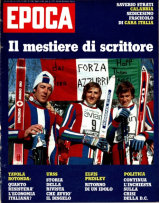 Vol. XCII n. 1191, 29/07/1973 (pubbl. 18 ottobre 2014) Scansione richiesta da una lettrice. La storia di copertina riguarda un concorso per tre “bellezze rinascimentali”, concluso con un servizio fotografico sulle tre bellissime vincitrici. Tra gli altri articoli interessanti, si comincia a parlare di “bambini in provetta“, argomento purtroppo ancora di attualità. Vol. XCII n. 1195, 24/08/1973 (pubbl. 13 febbraio 2012) Pubblichiamo questo fascicolo su richiesta di un lettore, interessato all’inserto a colori su Pantalica, la misteriosa valle dei sepolcri (realizzato dal grande Walter Bonatti). Tra gli altri servizi di interesse, la storia di copertina dedicata ai tanti misteri giudiziari irrisolti, e uno sul grande James Dean. Vol. XCIV n. 1215, 13/01/1974 (pubbl. 15 settembre 2020) ![]() L'argomento principale è l'attentato terroristico di Fiumicino. Si comincia a parlare dell'impatto ambientale degli allevamenti intensivi. Una commemorazione di Gino Cervi, morto il 3 gennaio. Il servizio centrale è dedicato all'impresa del Tauranga, la barca italiana impegnata nella regata intorno al mondo. Vol. XCVIII n. 1268, 25/01/1975 (pubbl. 31/01/2015) Quarant’anni fa la “valanga azzurra” dello sci si meritava una copertina e un servizio a colori. Per il resto l’Italia assisteva a una profonda crisi della DC (articoli di A. Colombo e P.P. Pasolini) e l’opininione pubblica si spaccava sull’aborto, ancora illegale in quegli anni. Elvis Presley quarantenne tornava a far parlare di sé, e la cronaca narrava la triste vicenda di Ermanno Lavorini. Vol. CI n. 1308, 01/11/1975 (pubbl. 16/01/2022) ![]() A metà degli anni '70 si comincia a parlare seriamente dei diritti delle donne. La pubblicità è dedicata alla tecnologia (primi videoregistratori, orlogi al quarzo) e all'eleganza maschile. Vol. CII n. 1330, 31/03/1976 (pubbl. 21 dicembre 2015) La piaga nazionale dei sequestri di persona a scopo di estorsione: si sceglie la linea dura; bilancio sulla Lira dopo dieci anni di inflazione selvaggia; si parla (come sempre) di Moby Dick Vol. CIII n. 1336, 12/05/1976 (pubbl. 07 dicembre 2015) Fascicolo richiesto per una tesi di laurea. La storia di copertina riguarda il grande pugile Cassius Clay, convertito all’islamismo col nuovo nome Muhammad Alì, una storia che fece molto scalpore in quegli anni. Marco Pannella suscita già apprensione con i suoi digiuni, Walter Bonatti parte alla ricerca del Mondo perduto, e in Italia si preparano le elezioni politiche, quelle del famoso “sorpasso”… Vol. CIV n. 1354, 15/09/1976 (pubbl. 27 agosto 2015) Pieni anni ’70: anni di processi, di stragi e di scandali finanziari. In copertina il bancarottiere Felice Riva che se la gode in Libano; all’interno un servizio sul confino coatto di Freda e Ventura all’isola del Giglio. Un bel servizio a colori sulle isole di Capo Verde, con il sub Jacques Mayol. Rispunta anche l’ombra del famoso processo Fenaroli-Ghiani, che negli anni ’50 divise l’opinione pubblica. A. XXVIII n. 1402, 17/08/1977 (pubbl. 22 aprile 2014) Pubblichiamo questo fascicolo su richiesta di un lettore interessato alla storia del Palio di Siena. Da non perdere tra l’altro un bellissimo servizio a colori sul Mare di Napoli visto dall’alto (fotografie di Mario de Biasi)